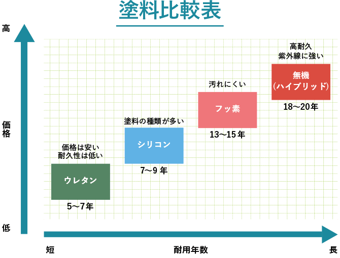 塗料はシリコン、フッ素、無機の3種類が一般的で、それぞれ耐久年数と価格に差があります。